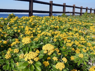 The island is also home to a rich variety of other plants and flowers that add color from spring to autumn, such as Hama-nadeshiko (Dianthus japonicus), Hama-bossu (Lysimachia mauritiana), Taitogome (Sedum oryzifolium spp. oryzifolium), Hama-hirugao (Calystegia soldanella), Sukashiyuri (Lilium maculatum), Hama-kanzo (Hemerocallis fulva var. littorea), Hama-Gou (Vitex rotundifolia), Hama-Shazin (Adenophora triphylla var. japonica form.), Botanboufu (Peucedanum japonicum Thanb), Tsuwabuki (Farfugium japonicum (L. fil.) Kitam.), and Wadan (Crepidiastrum platyphyllum).