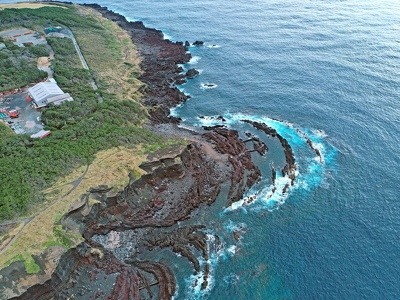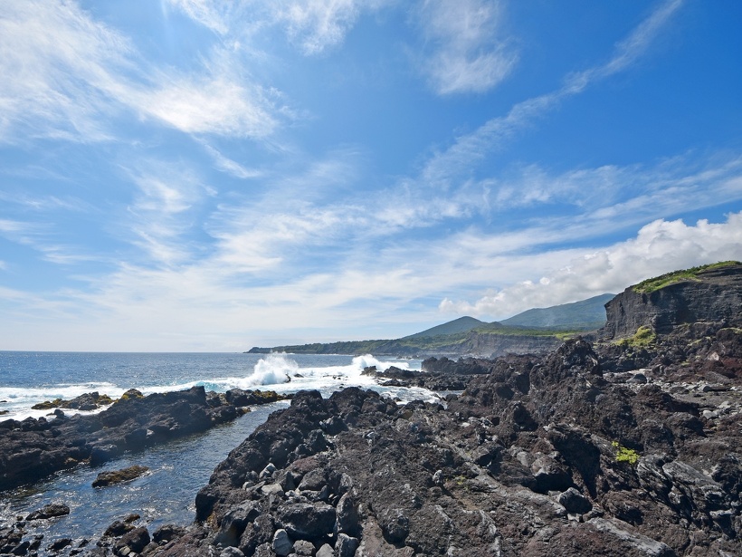 At the top of the 40m high sea cliffs on the Toushiki Coast, there is a thick deposit of angular pebbles blown away by a magmatic phreatomagmatic explosion off Imasaki in 1421. The lava flow at the foot of the cliff is the result of an eruption thousands of years ago that reclaimed the southern tip of the island. The surface of the lava is undulating, and from a bird's-eye view of the cliffs you can see concentric arcs stretching out into the sea.