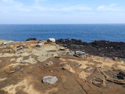 During a particularly explosive eruption, ejected rocks landed in a layer of volcanic ash, compressing the ash into hard craters. The ejected rocks and leftover imprints of the collision remain here, expressing the immense power of the eruption. From the shape of the imprints, it is estimated that the rocks were thrown from the eruption that formed the volcanic crater in Habu Port, a whopping 500m away. (The cliffs have been eroding and the rocks are collapsing.)