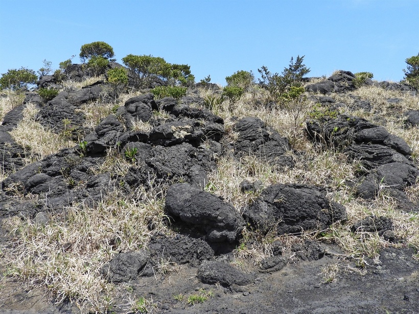 As you walk along the summit promenade towards Mt. Mihara, you will see on your left many small hills formed by the great eruption of 1777-78 (An'ei era). This eruption started from the summit crater and spewed out a lot of lava fountains and scoria, forming the Central Cone "Mt. Mihara". Later, lava flows spread out from the north-western foot of the mountain, rather than from the summit, creating many small hills in the area.