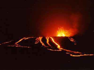 The surface is composed of lumps of rough rubbly rocks. This kind of lava is called "A'a lava." As the lava flows, the surface exposed to the air cools first and solidify to a crust. However, since the inside of the lava keeps high temperature, it still moves, so that crust surface is crushed, and a lot of rugged clinker is accumulated.