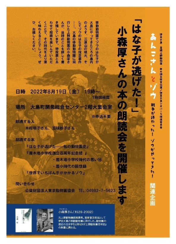 移動動物園でゾウのはな子が大島にやってきたころの島内のようす、三原山の噴火、そしてゾウのはな子の脱走事件……。大島の移動動物園に同行した上野動物園の小森厚さんが、当時のことを詳しく書き残しています。特設展とあわせて朗読を楽しんでいただくことで、その時代をより深く味わえることでしょう。ぜひ、お越しください。※申込不要