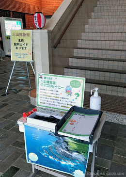1.火山博物館入口のエントランスホールで解答用紙と筆記用具を入手してください。