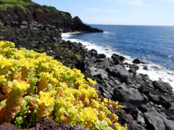 海の青と溶岩の黒を背景に、季節に応じて海岸植物が彩ります。