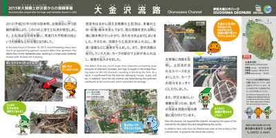 しかし、2013年10月16日、台風豪雨による斜面崩壊が起こり、大金沢をはじめとする複数の沢で流木を伴った土砂が大量に流出しました。元町地区では死者・行方不明者39名、住宅被害153棟に及ぶ甚大な被害が発生しました。そのような中で、大金沢堆積工の上流側のスリットダムでは大量の流木や巨礫を捕捉し、下流側のコンクリート堰堤で小さい石や土砂を堰き止めるなど、砂防施設が被害軽減に一定の効果を発揮したことも確認されました。