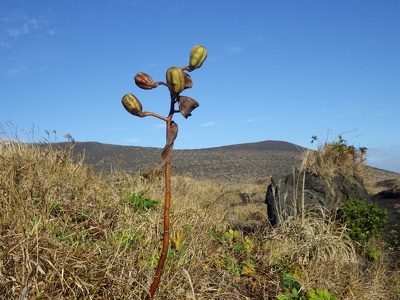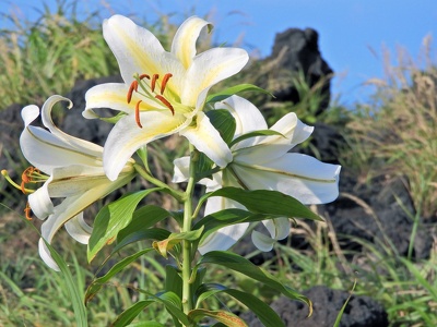 明るい樹林内や林縁に生育し、草丈は150~200cm、花径25~30cmの大きな白い花をつけ、草丈も花の大きさもユリ属では世界最大といわれています。山頂カルデラ内では7月下旬から8月初旬に開花します。
