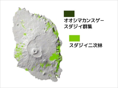 島内では標高10m~440mまでの標高500m以下の山麓部に分布しており、自然林と、かつて薪炭利用のために伐採された萌芽再生林とがあります。スダジイが群落としてまとまって見られるのは、シイノキ群叢のほか、愛宕山、七見沢、大島公園周辺、フノウの滝周辺、大宮神社等です。スダジイの下方には、亜高木、低木としてヤブツバキ、シロダモ、カクレミノなど、林床はオオシマカンスゲ、ベニシダ、アスカイノデ、ちょっと日が当たる場所ではテイカカズラで覆われています。