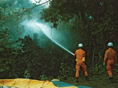 翌朝からは、溶岩の流れを食い止め、かつ、火災の発生を防ぐため、東京消防庁が6トンのコンクリートミキサー車5台を使って海水を運んで水槽に貯め、ポンプ車で溶岩先端部に放水して溶岩の冷却作業を行いました。