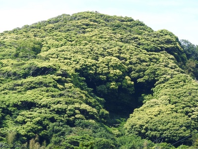 かつて伊豆大島では薪炭を作るために、島じゅうの多くの木が伐採されていました。しかし、愛宕山には神社が置かれ山が守られていたため、スダジイ・タブノキの極相林が発達し、巨木の森を形成しています。