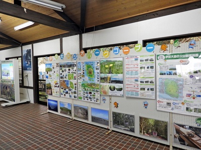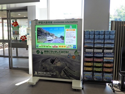 4ヵ国語対応デジタルサイネージ、パンフレットラック、ポスターコーナー/さまざまな溶岩や火山弾な実物展示