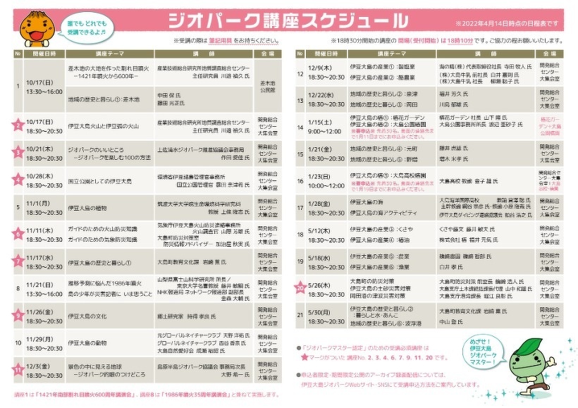 2020年10月~2021年5月に開催した「伊豆大島ジオパーク講座」において、以下の要件を満たした方を「伊豆大島ジオパークマスター」に認定いたします。