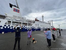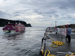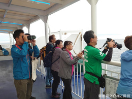 帰りの出帆港は岡田港。ジオステーションおかた港にて、平田和彦氏(千葉県立中央博物館分館 海の博物館・研究員)の海鳥ミニセミナーが開催されました。そして、東京竹芝行きの大型船または高速船でお帰りの皆様をお見送り。大型船利用の参加者は、平田さんのオプショナルプログラム・海鳥観察会付きでした!