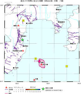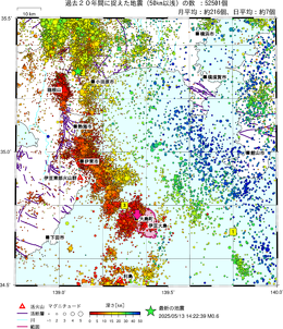 ・過去24時間から20年間までの地震の震源分布を切り替えて表示できます