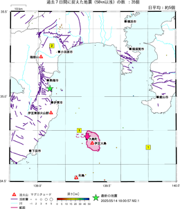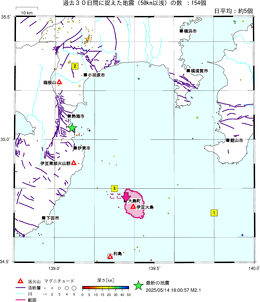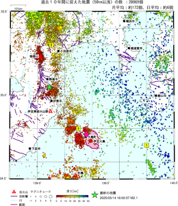 ・最新の地震は星印で表示され、地震活動の移り変わりを視覚的にとらえることができます
