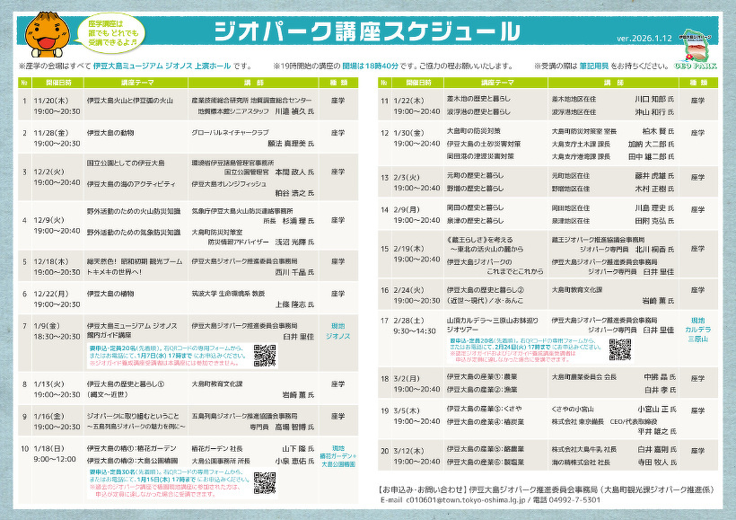 2026年01月13日(火) お知らせ ジオパーク講座スケジュールが確定しました! 伊豆大島ジオパーク講座、全20講座の日程が確定しました。 スケジュールは以下からダウンロードできますので、どうぞご覧ください! 【確定版】ジオパーク講座2025 開催案内 ver.20260112 ダウンロードDownload
